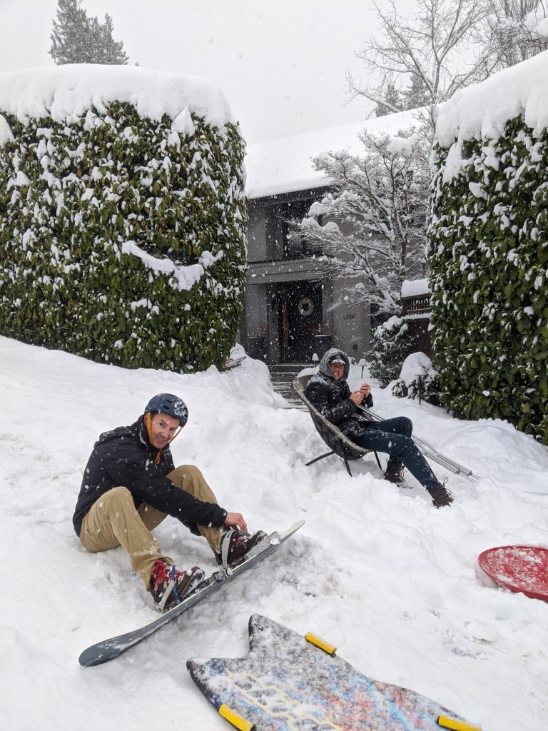 Sadly, this storm our skis were all elsewhere so I rummaged through the garage and found a couple of toboggans and an old snowboard. That was it. I had skied down the hill right outside my house – literally out the end of our driveway – now I was going to snowboard down the same slope.