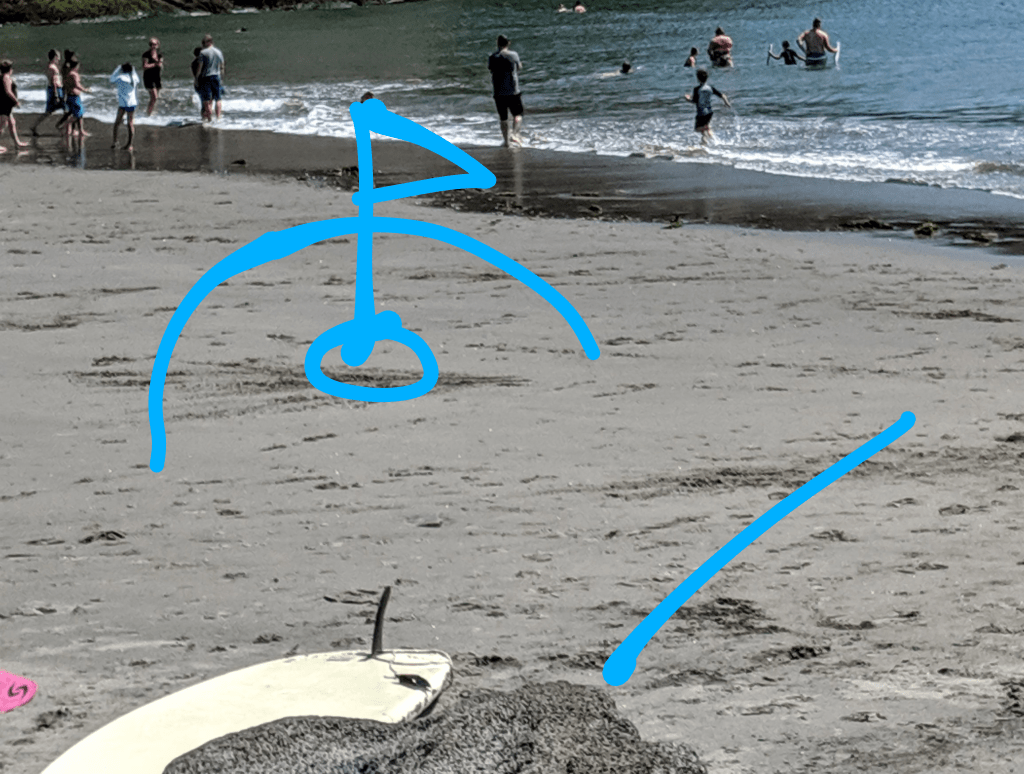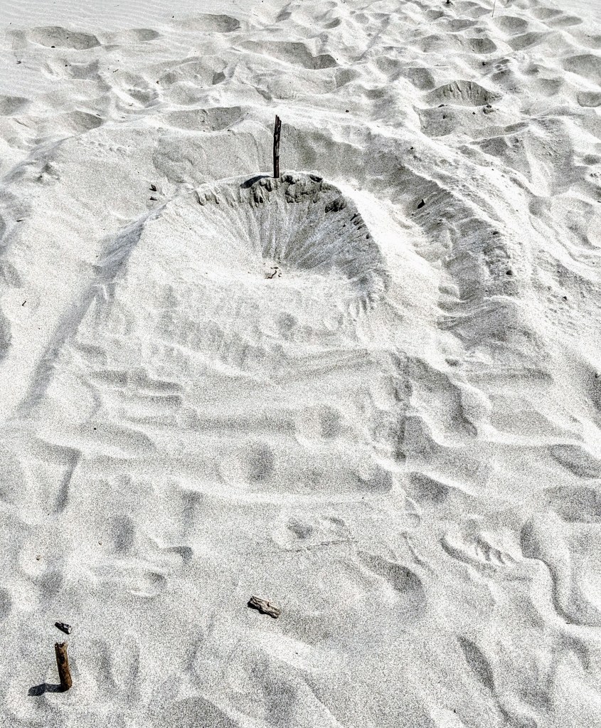 I came up with this game one beautiful sunny afternoon on a beach at the southwestern tip of Washington State. My youngest son and I were throwing a Frisbee back and forth but the wind made that a challenge. We persevered but with other people enjoying the same beach our errant Frisbee caught by the wind just didn’t work. So we started tossing a ball between us. The strong, gusty breeze made this a different kind of challenge until we started trying to land the ball near a target some distance away. Before we knew it, we were carving a depression in the sand and making up rules. Having two people meant one stood over the Dish and fired the ball back to the thrower so the game could move along without getting dull. Adding the centre stick, the Again Channel and determining how to keep score all just fell into place as we played.